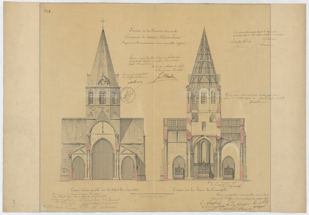 Opschrift: Province de la Flandre Orientale. Commune de Bachte Maria Leerne. Projet pour la construction d'une nouvelle église. Omschrijving plan: dwarsdoorsnede, dwarsdoorsneden op het schip en de zijbeuken en op de toren en transepten Datum KCML: 13/05/1876 Archiefnummer: O0285