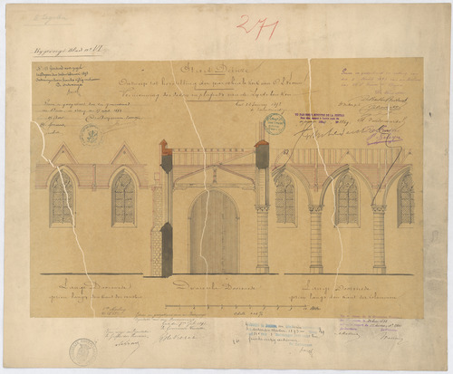 Opschrift: Stad Deinze. Ontwerp tot herstelling der parochiale kerk van O.L.Vrouw Omschrijving plan: langs- en dwarsdoorsnede Datum KCML: 27/04/1892 Archiefnummer: O0267