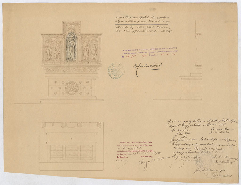 Opschrift: Nieuwe kerk van Opstal-Buggenhout. Algemeen ontwerp van bemeubeling. Zijaltaar (H.H. Patronen) Omschrijving plan: voor- en zijaanzicht en plattegrond Datum KCML: 23-5-1908 Archiefnummer: O0227