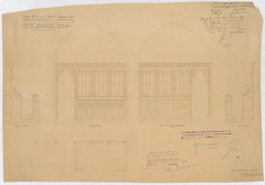Opschrift: Nieuwe kerk van Opstal-Buggenhout. Algemeen ontwerp van bemeubeling. Koorgestoelten - afsluitingen Omschrijving plan: voor- en zijaanzicht, plattegrond en doorsnede Datum KCML: 23-5-1908 Archiefnummer: O0228
