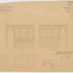 Opschrift: Nieuwe kerk van Opstal-Buggenhout. Algemeen ontwerp van bemeubeling. Koorgestoelten - afsluitingen Omschrijving plan: voor- en zijaanzicht, plattegrond en doorsnede Datum KCML: 23-5-1908 Archiefnummer: O0228