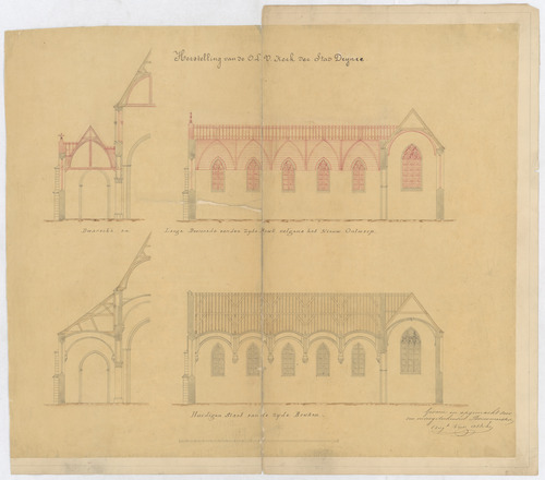 Opschrift: Herstelling van de O.L.V. kerk der Stad Deynze Omschrijving plan: langs- en dwarsdoorsnede van de zijbeuk, huidige toestand en ontwerp Datum KCML: deze informatie wordt niet vermeld op het archiefstuk Archiefnummer: O0256