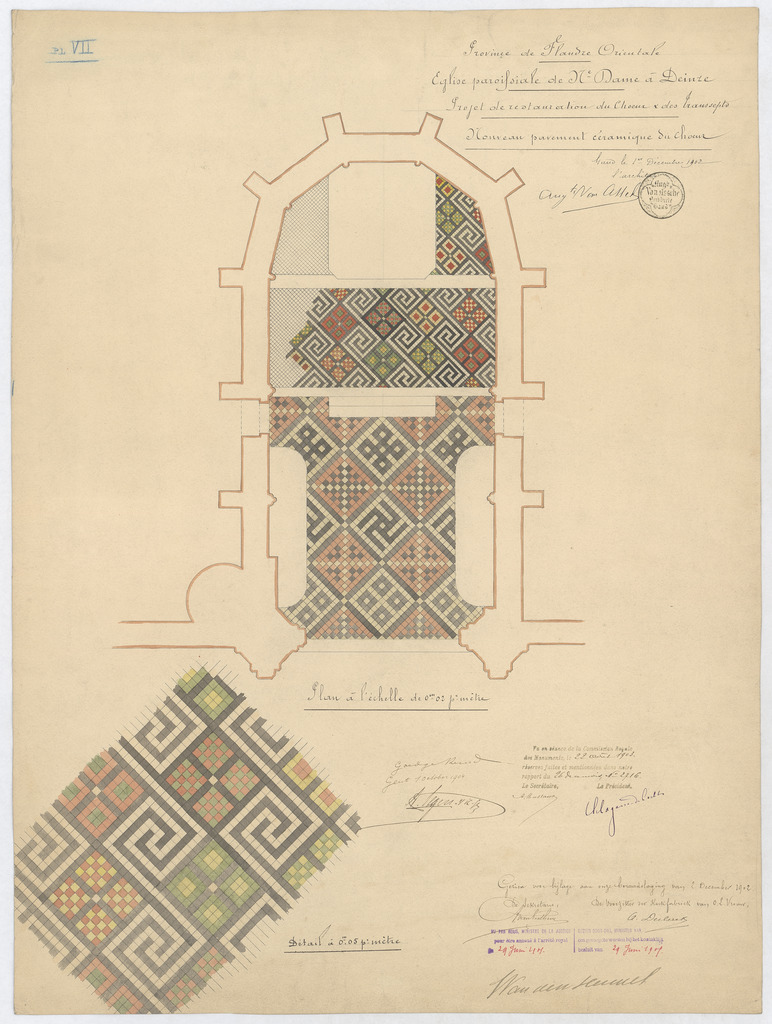 Opschrift: Province de Flandre Orientale. Eglise paroissiale de N.Dame à Deinze. Projet de restauration du choeur & des transepts. Nouveau pavement céramique du choeur. Omschrijving plan: plattegrond niveau 0, Nieuwe betegeling van het koor Datum KCML: deze informatie wordt niet vermeld op het archiefstuk Archiefnummer: O0277