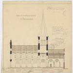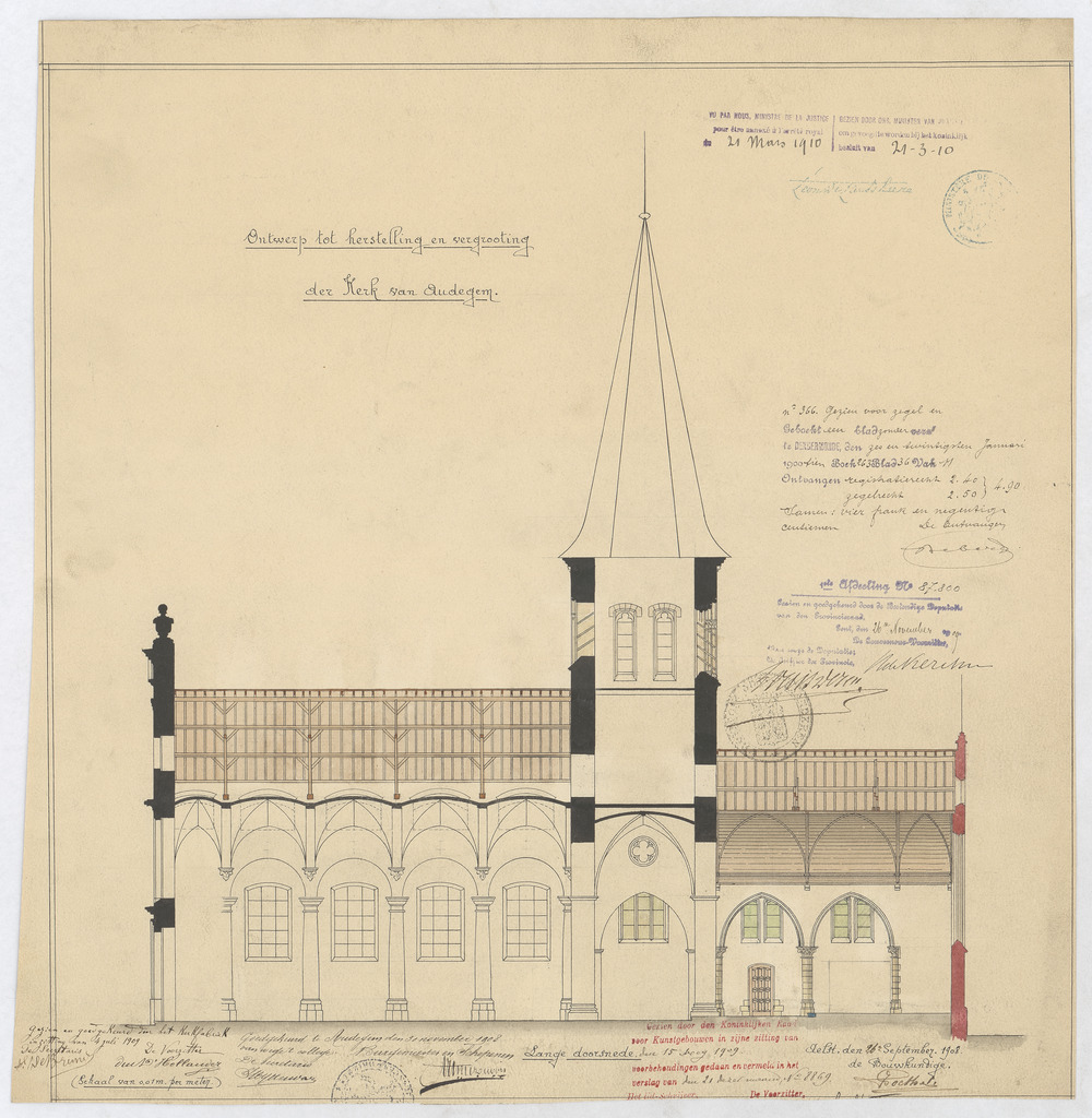 Opschrift: Ontwerp tot herstelling en vergrooting der Kerk van Audegem. Omschrijving plan: langsdoorsnede Datum KCML: 15-5-1909 Archiefnummer: O0338