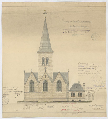 Opschrift: Ontwerp tot herstelling en vergrooting der Kerk van Audegem. Omschrijving plan: opstand achtergevel Datum KCML: 15-5-1909 Archiefnummer: O0335