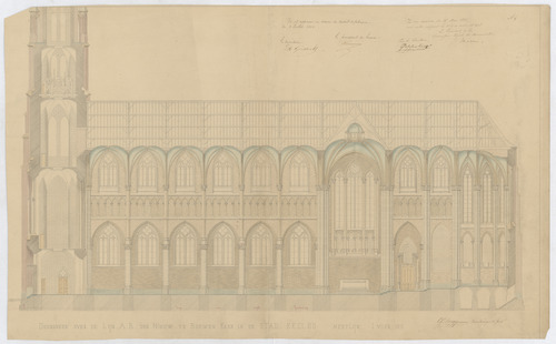 Opschrift: Ontwerp der nieuw te bouwen kerk in de stad Eecloo Omschrijving plan: langsdoorsnede Datum KCML: 27/05/1865 Archiefnummer: O0371