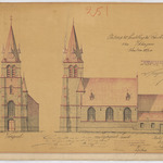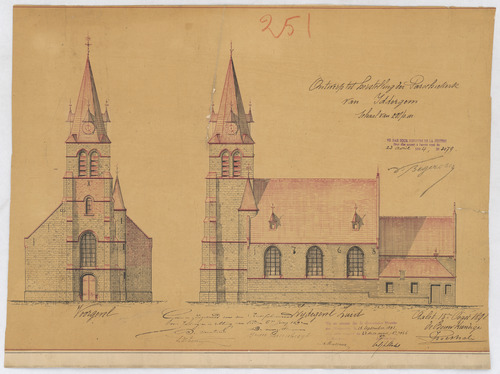 Opschrift: Ontwerp tot herstelling der Parochiekerk van Iddergem Omschrijving plan: opstand voorgevel en zijgevel zuid Datum KCML: 16/09/1893 Archiefnummer: O0319