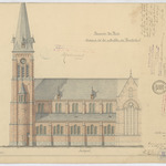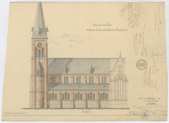 Opschrift: Gemeente De Pinte. Ontwerp tot het voltrekken der parochiekerk. Omschrijving plan: opstand Z-gevel Datum KCML: 4-3-1911 Archiefnummer: O0365