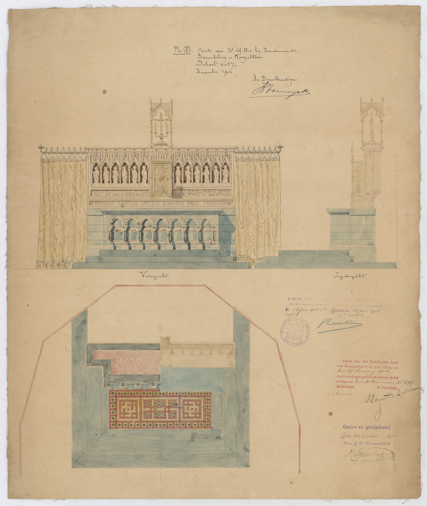 Opschrift: Kerk van St. Gillis bij Dendermonde. Bemeubeling - Hoogaltaar. Omschrijving plan: plattegrond, voor- en zijaanzicht van hoogaltaar Datum KCML: 27-1-1906 Archiefnummer: O0349