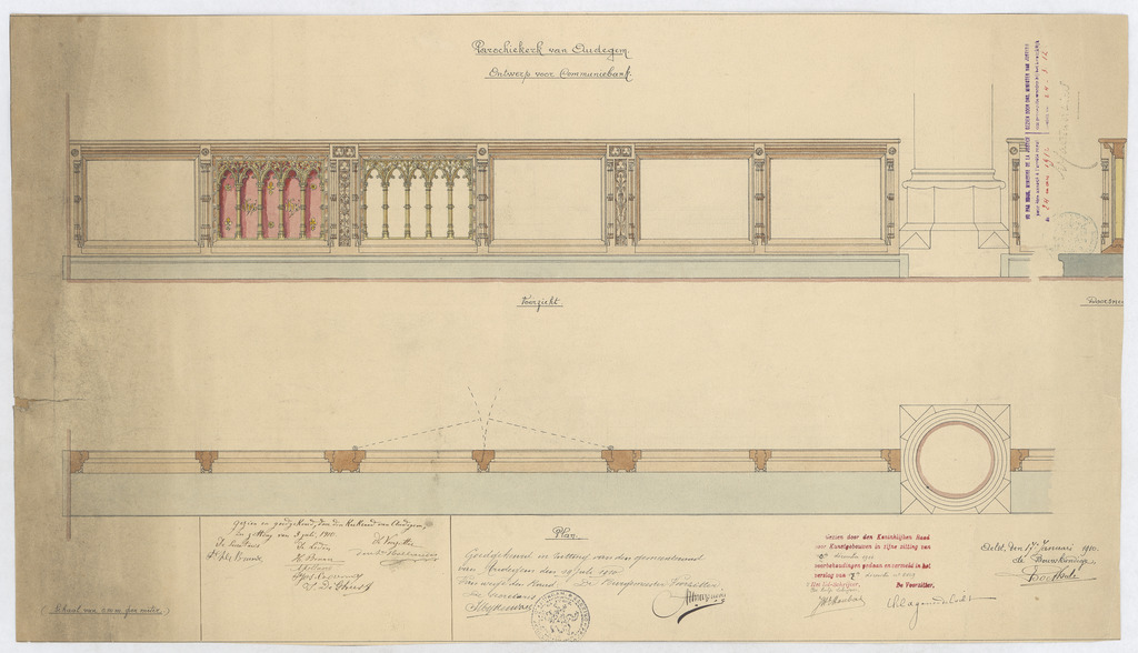 Opschrift: Parochiekerk van Audegem. Ontwerp voor Communiebank Omschrijving plan: vooraanzicht en plattegrond communiebank Datum KCML: 10-12-1910 Archiefnummer: O0342