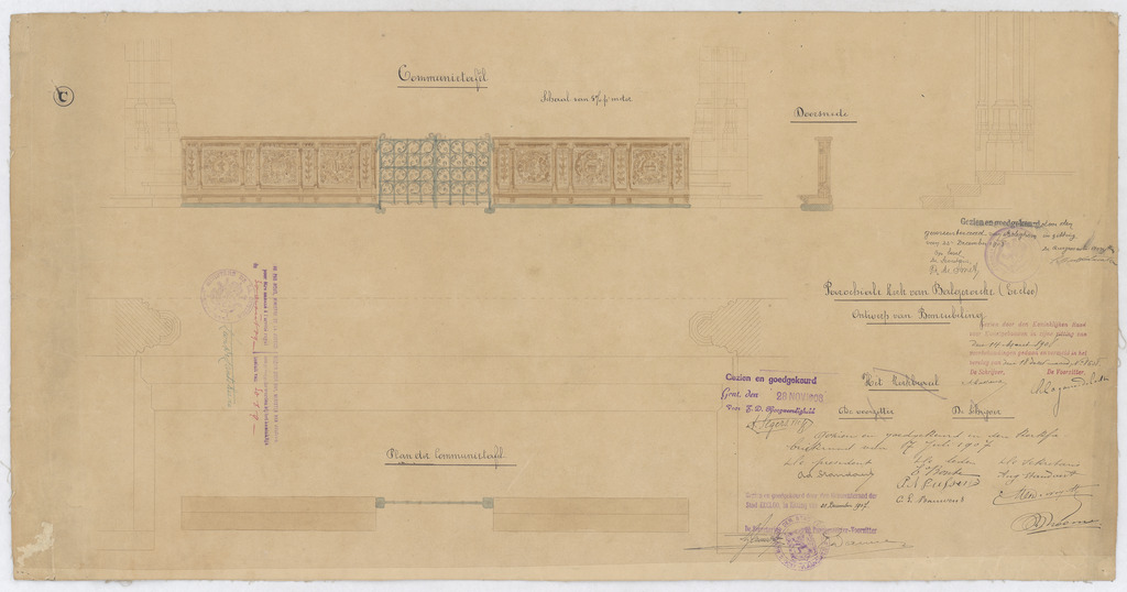 Opschrift: Parochiale kerk van Balgeroeke (Eecloo). Ontwerp van bemeubeling. Omschrijving plan: plattegrond, voor- en zijaanzicht communiebank Datum KCML: 14-3-1908 Archiefnummer: O0397