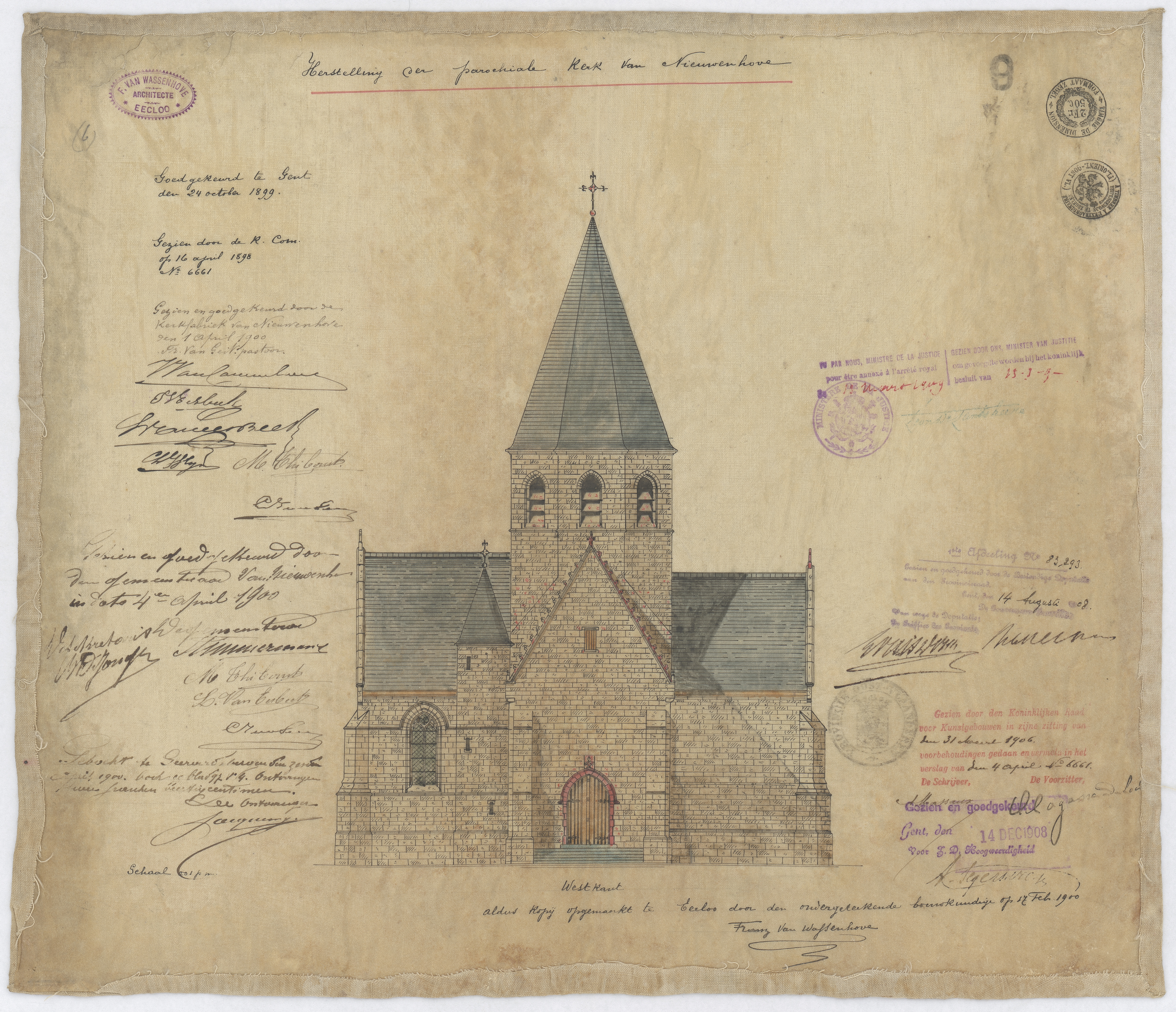 Opschrift: Herstelling aan de parochiale kerk van Nieuwenhove. Omschrijving plan: opstand voorgevel Datum KCML: 31-3-1906 Archiefnummer: O0484