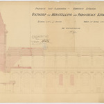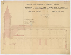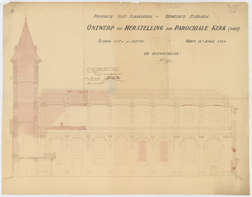 Opschrift: Provincie Oost-Vlaanderen. Gemeente Evergem. Ontwerp tot herstelling der parochiale kerk. Omschrijving plan: langsdoorsnede Datum KCML: deze informatie wordt niet vermeld op het archiefstuk Archiefnummer: O0427