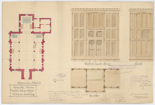 Opschrift: Provincie Oost-Vlaanderen. Parochiale kerk van Ottergem. Ontwerp van bemeubeling Omschrijving plan: plattegrond met plaatsing meubilair, plattegrond, voor- en zijaanzicht biechtstoel Datum KCML: 16-2-1900 Archiefnummer: O0416