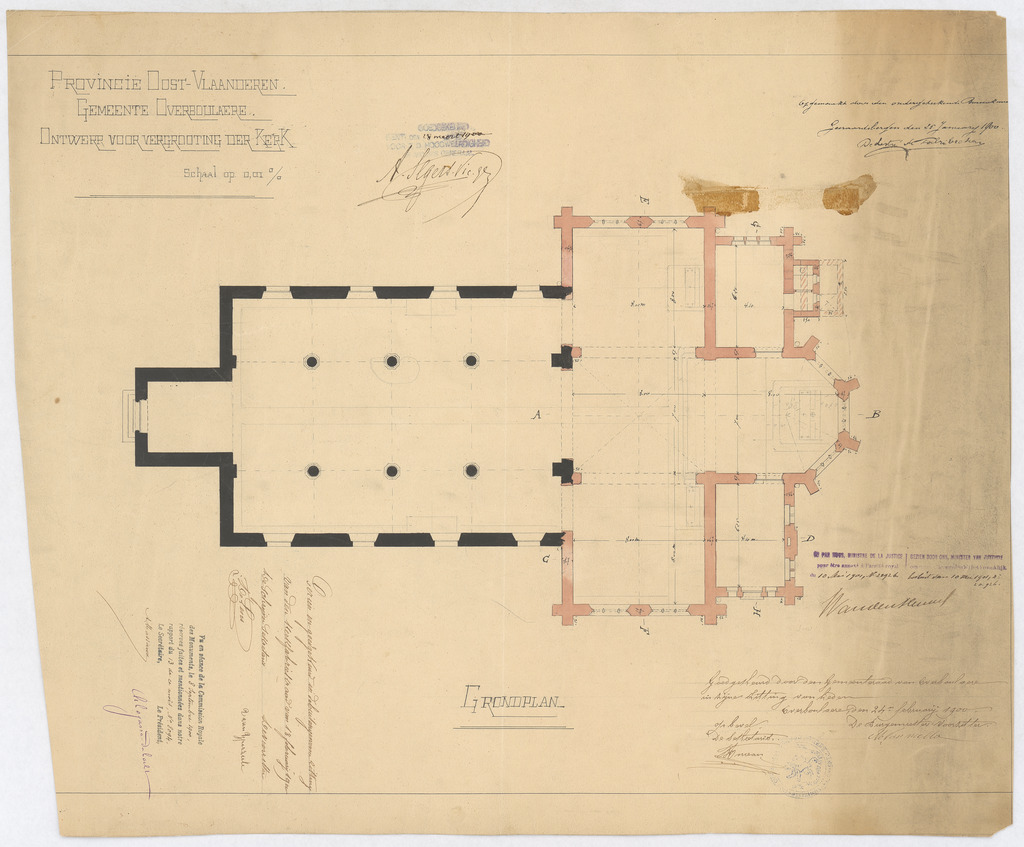 Opschrift: Provincie Oost-Vlaanderen. Gemeente Overboulaere. Ontwerp voor vergrooting der Kerk. Omschrijving plan: plattegrond niveau 0 Datum KCML: 8-9-1900 Archiefnummer: O0492