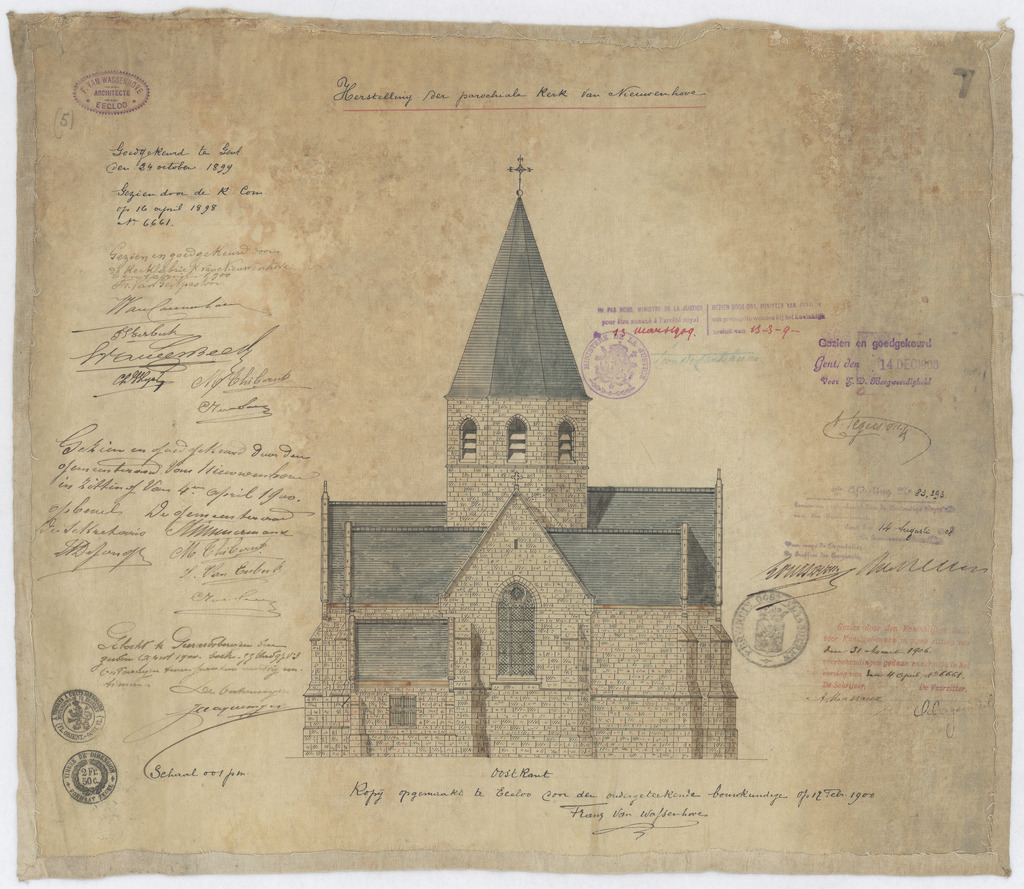 Opschrift: Herstelling aan de parochiale kerk van Nieuwenhove. Omschrijving plan: opstand O-gevel Datum KCML: 31-3-1906 Archiefnummer: O0482