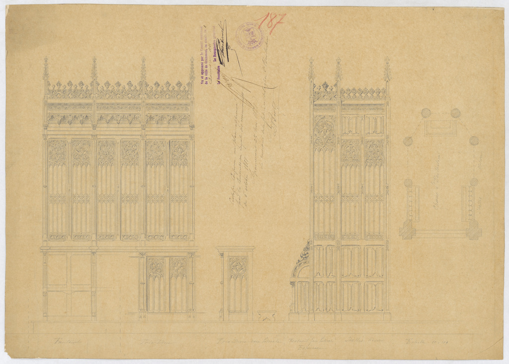 Opschrift: deze informatie wordt niet vermeld op het archiefstuk Omschrijving plan: voor- en zijaanzicht koorgestoelte en bidbanken Datum KCML: 06/10/1888 Archiefnummer: O0461