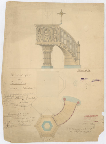 Opschrift: Parochiale kerk van Nieuwenhove. Ontwerp van Preekstoel. Omschrijving plan: plattegrond en vooraanzicht preekstoel Datum KCML: 11-6-1910 Archiefnummer: O0490_02