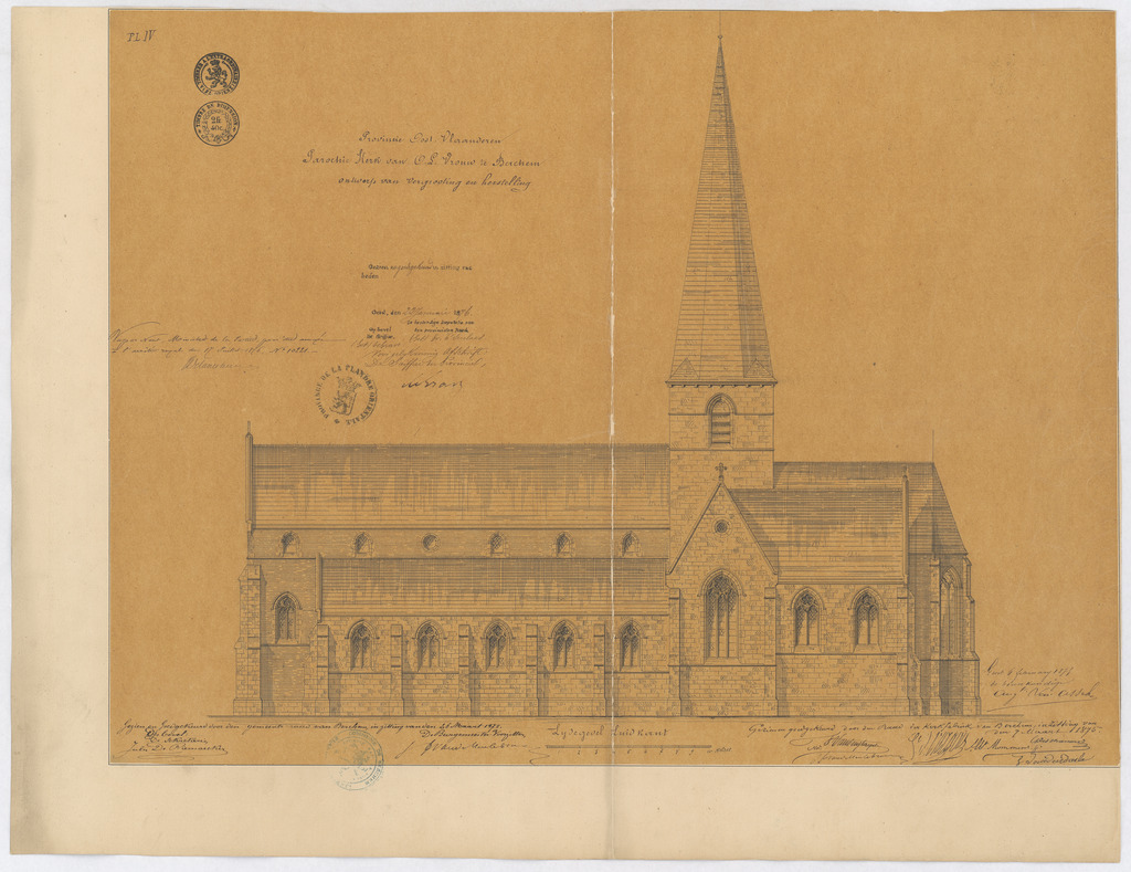 Opschrift: Provincie Oost-Vlaanderen. Parochiekerk van O.L.Vrouw te Berchem. Ontwerp tot vergrooting en herstelling. Omschrijving plan: opstand Z-gevel Datum KCML: deze informatie wordt niet vermeld op het archiefstuk Archiefnummer: O0583