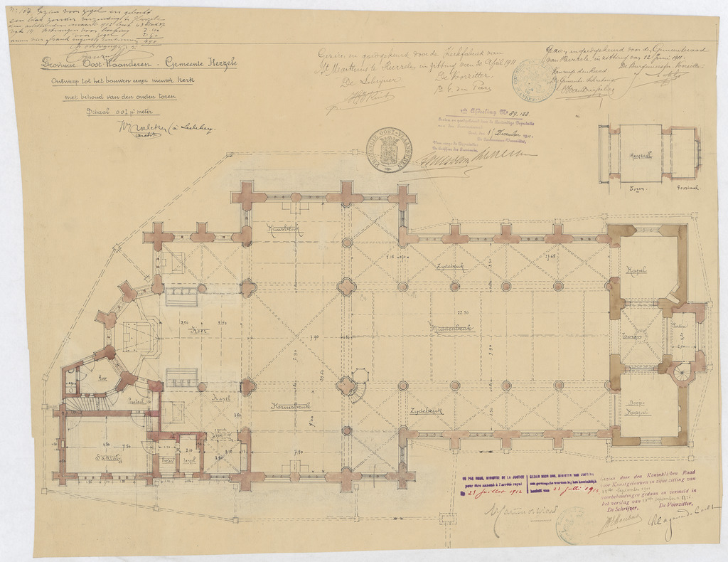 Opschrift: Provincie Oost-Vlaanderen. Gemeente Herzele. Ontwerp tot het bouwen eener nieuwe kerk met behoud van den ouden toren. Omschrijving plan: plattegrond niveau 0 Datum KCML: 23-9-1911 Archiefnummer: O0543