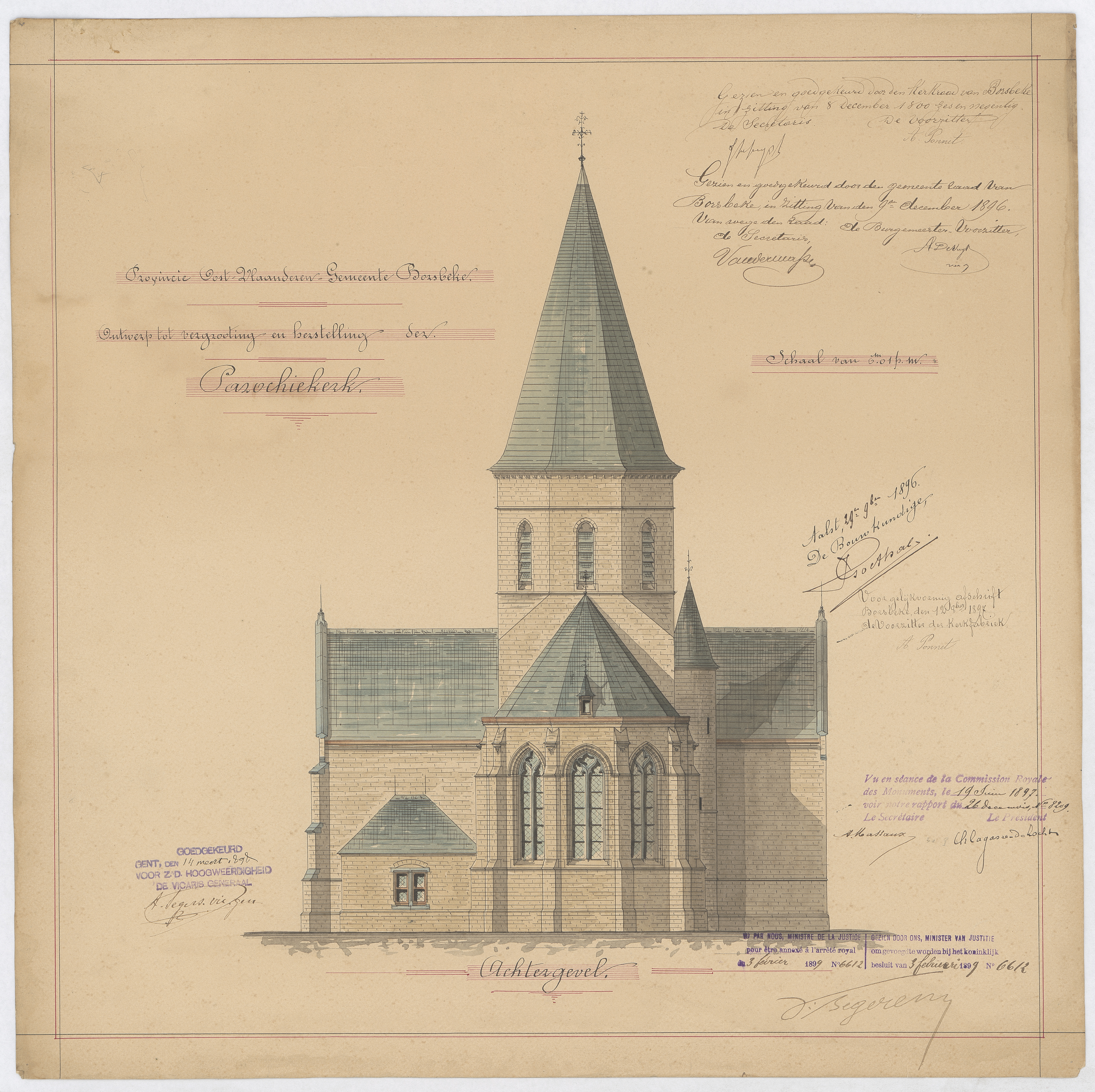 Opschrift: Provincie Oost-Vlaanderen - Gemeente Borsbeke. Ontwerp tot vergrooting en herstelling der parochiekerk. Omschrijving plan: opstand achtergevel Datum KCML: 19/06/1897 Archiefnummer: O0551