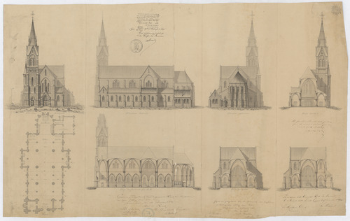 Opschrift: Knesselaere. Projet d'Eglise. Omschrijving plan: plattegrond, opstanden voor- zij- en achtergevel, langs- en dwarsdoorsneden Datum KCML: 10/12/1881 Archiefnummer: O0588