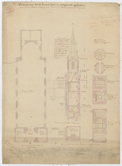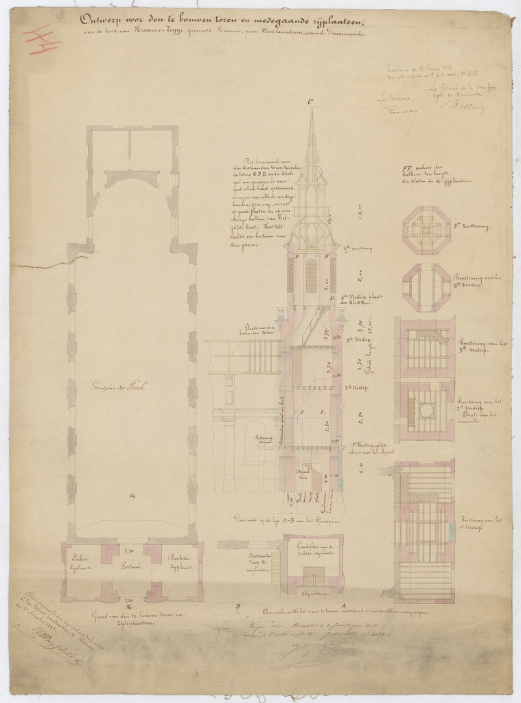 Opschrift: Ontwerp voor den te bouwen toren en medegaande zijplaatsen aan de kerk van Hamme-Zogge, gemeente Hamme, prov. Oostvlaanderen, arrond. Dendermonde. Omschrijving plan: plattegrond, doorsneden toren Datum KCML: 12/02/1867 Archiefnummer: O0541