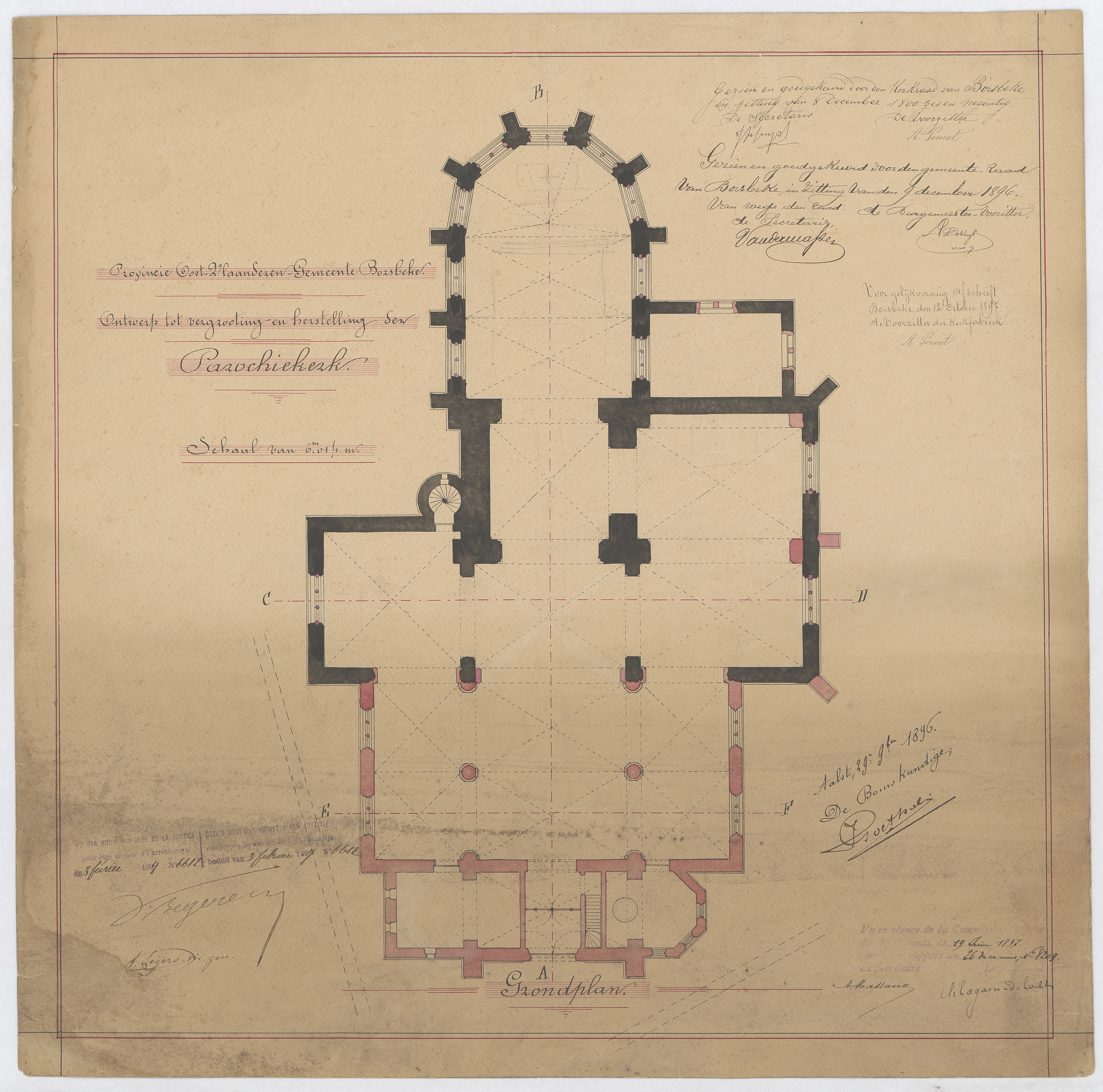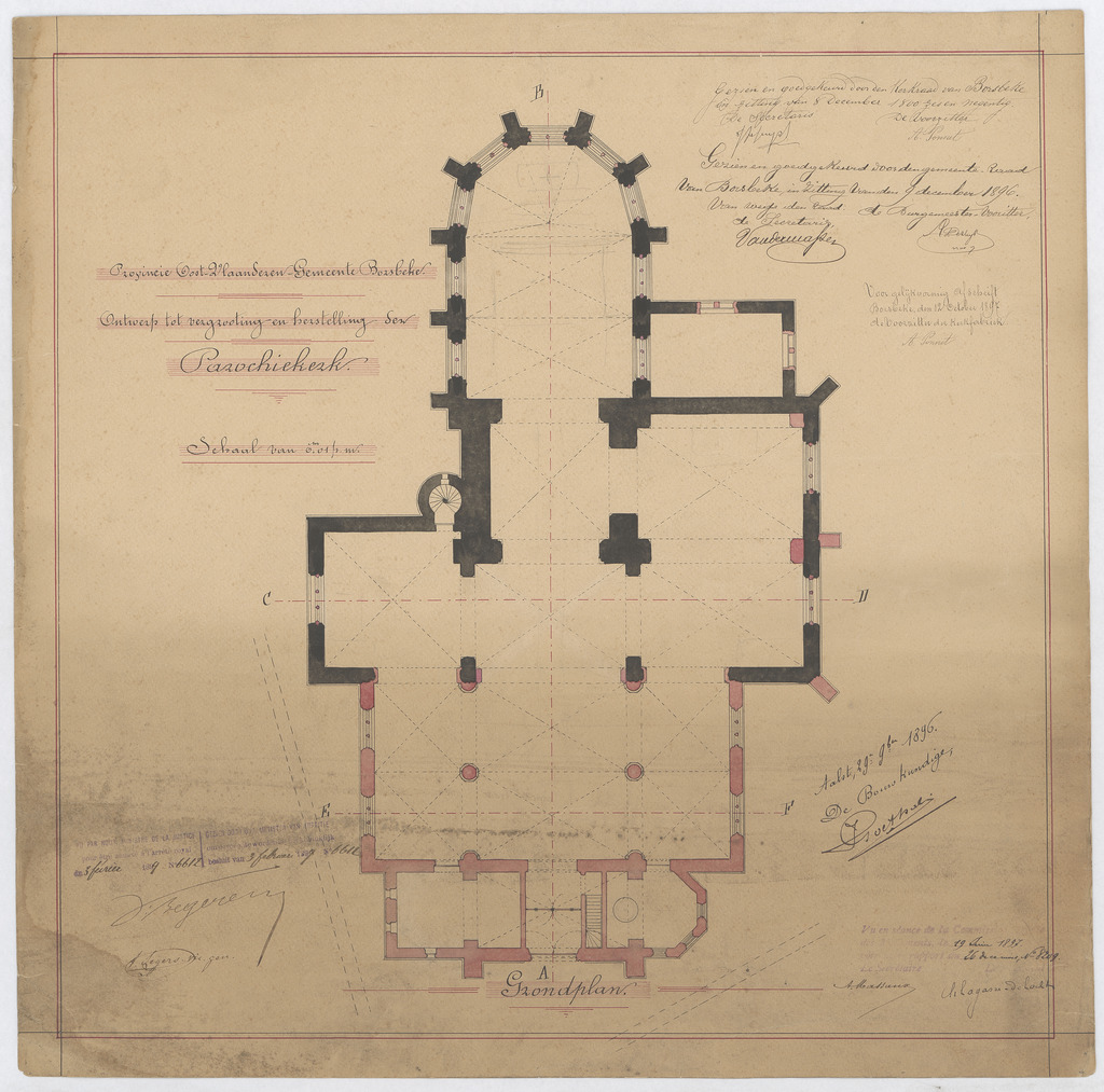 Opschrift: Provincie Oost-Vlaanderen - Gemeente Borsbeke. Ontwerp tot vergrooting en herstelling der parochiekerk. Omschrijving plan: plattegrond niveau 0 Datum KCML: 19/06/1897 Archiefnummer: O0549