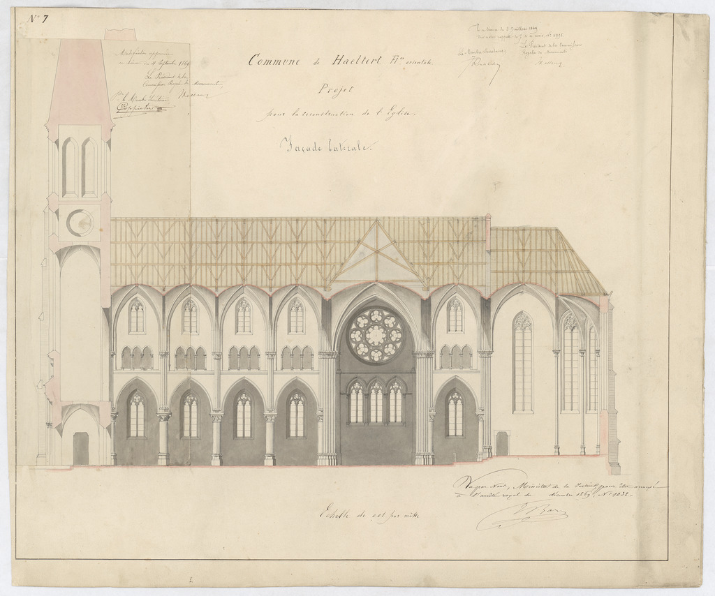 Opschrift: Commune de Haeltert. Fl. Orient. Projet pour la reconstruction de l'Eglise Omschrijving plan: langsdoorsnede Datum KCML: 03/07/1869 Archiefnummer: O0513