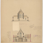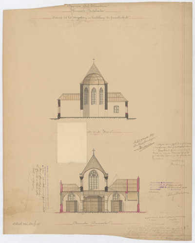 Opschrift: Provincie Oost-Vlaanderen. Gemeente Denderhoutem. Ontwerp tot vergrooting en herstelling der parochiekerk. Omschrijving plan: dwarsdoorsnede Datum KCML: 11/09/1897 Archiefnummer: O0521_02