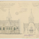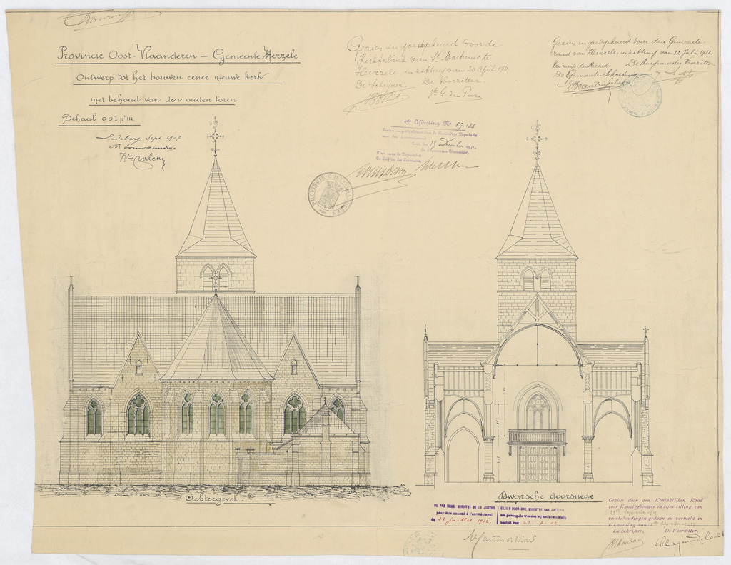 Opschrift: Provincie Oost-Vlaanderen. Gemeente Herzele. Ontwerp tot het bouwen eener nieuwe kerk met behoud van den ouden toren. Omschrijving plan: opstand achtergevel en dwarsdoorsnede Datum KCML: 23-9-1911 Archiefnummer: O0545