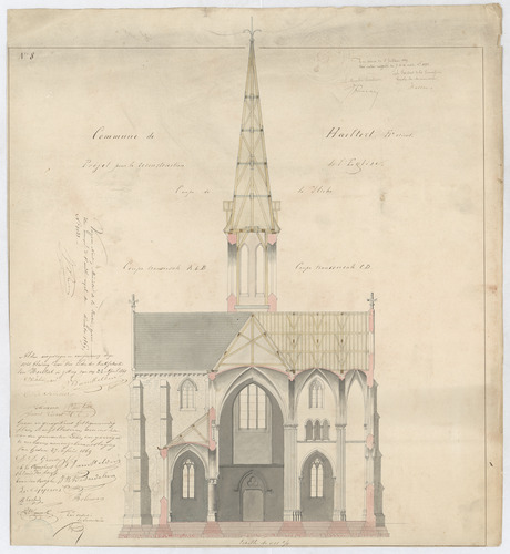 Opschrift: Commune de Haeltert. Fl. Orient. Projet pour la reconstruction de l'Eglise. Omschrijving plan: dwarsdoorsnede, doorsneden op A-B,op C-D en op de toren Datum KCML: 03/07/1869 Archiefnummer: O0514