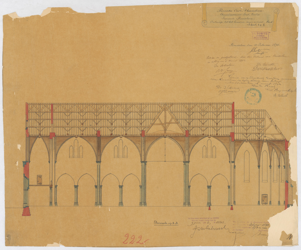 Opschrift: Provincie Oost-Vlaanderen. Arrondissement Gent-Eecloo. Gemeente Knesselare. Ontwerp tot het bouwen eener nieuwe kerk. Omschrijving plan: langsdoorsnede Datum KCML: 20/02/1892 Archiefnummer: O0595