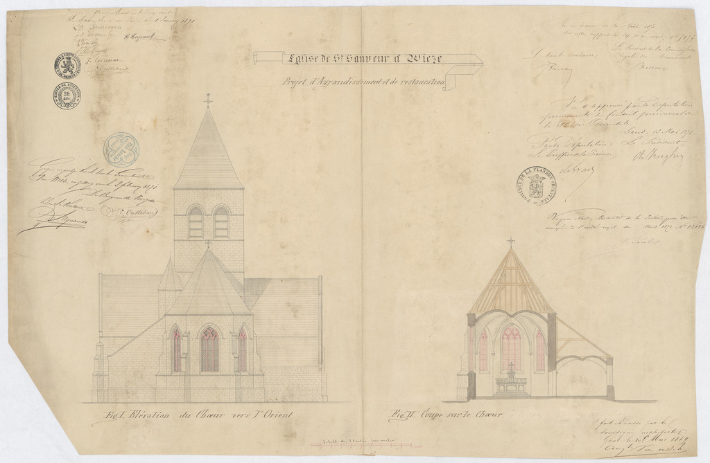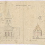 Opschrift: Eglise de St. Sauveur à Wieze. Projet d'agrandissement Omschrijving plan: opstand achtergevel en dwarsdoorsnede op het koor Datum KCML: 20/08/1870 Archiefnummer: O0670
