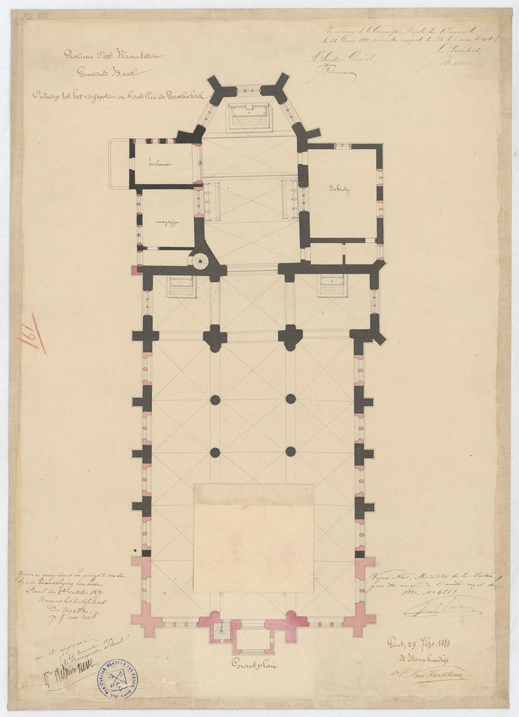 Opschrift: Provincie Oost-Vlaanderen. Gemeente Basel. Ontwerp tot het vergrooten en herstellen der parochiekerk. Omschrijving plan: plattegrond niveau 0 Datum KCML: 21/02/1880 Archiefnummer: O0631_02