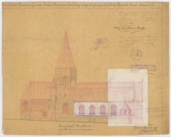 Opschrift: Provincie Oost-Vlaanderen. Gemeente Nokere. Ontwerp van herstelling en vergrooting der parochiale kerk. Herstelde staat. Omschrijving plan: opstand N-gevel Datum KCML: 28/11/1896 Archiefnummer: O0649