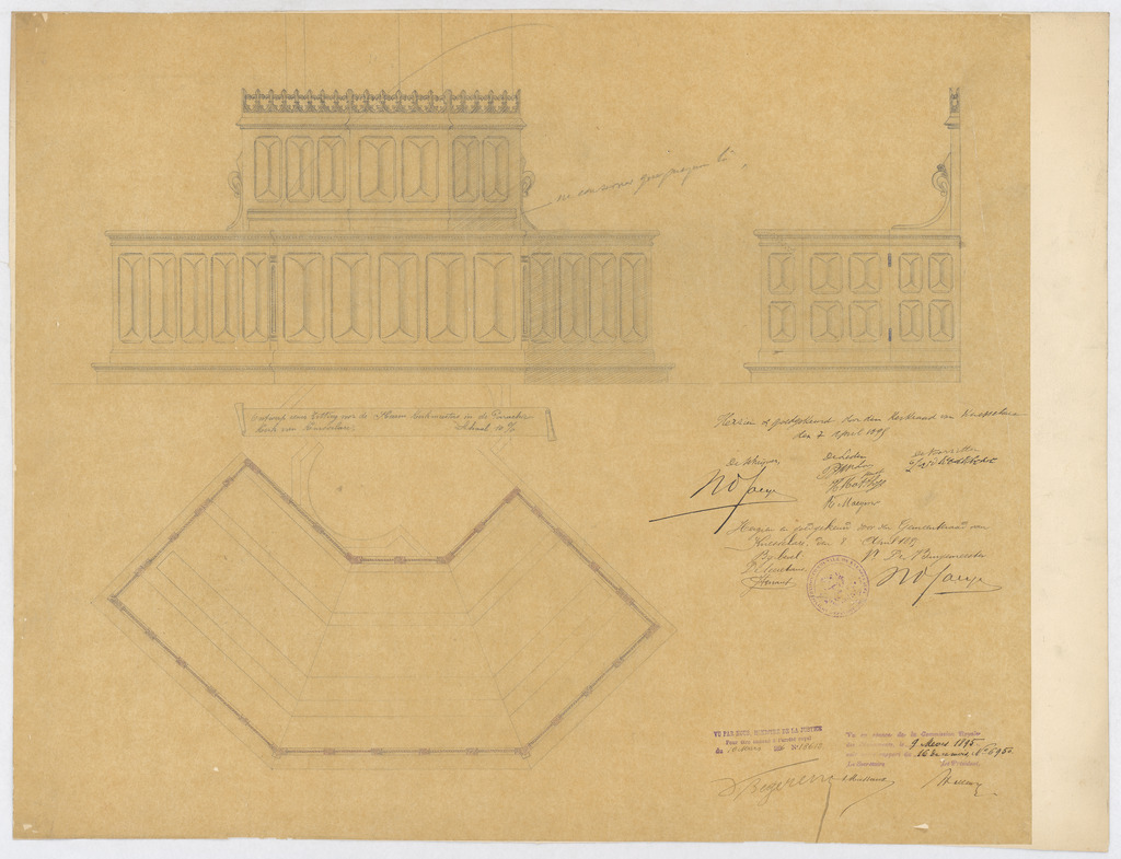 Opschrift: Ontwerp eener zitting voor de Heeren Kerkmeesters in de parochiekerk van Knesselare. Omschrijving plan: plattegrond, voor- en zijaanzicht gestoelte kerkmeesters Datum KCML: 09/03/1895 Archiefnummer: O0605