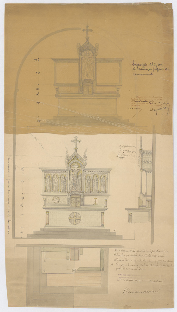 Opschrift: Hoogaltaar voor de parochiekerk tot Smetlede Omschrijving plan: plattegrond, voor- en zijaanzicht hoogaltaar (aangepast ontwerp) Datum KCML: 5-4-1902 Archiefnummer: O0682_01