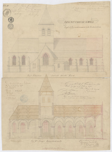 Opschrift: Eglise de St. Sauveur à Wieze. Projet d'agrandissement Omschrijving plan: opstand zijgevel en langsdoorsnede Datum KCML: 20/08/1870 Archiefnummer: O0668