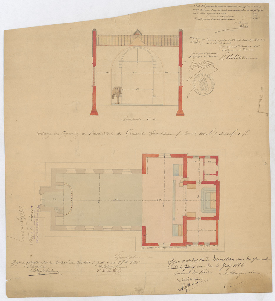 Opschrift: Ontwerp van vergrooting der parochiekerk der Gemeente Smetlede (provincie oostvl.) Omschrijving plan: plattegrond en dwarsdoorsnede Datum KCML: deze informatie wordt niet vermeld op het archiefstuk Archiefnummer: O0680