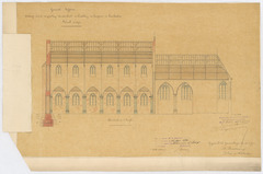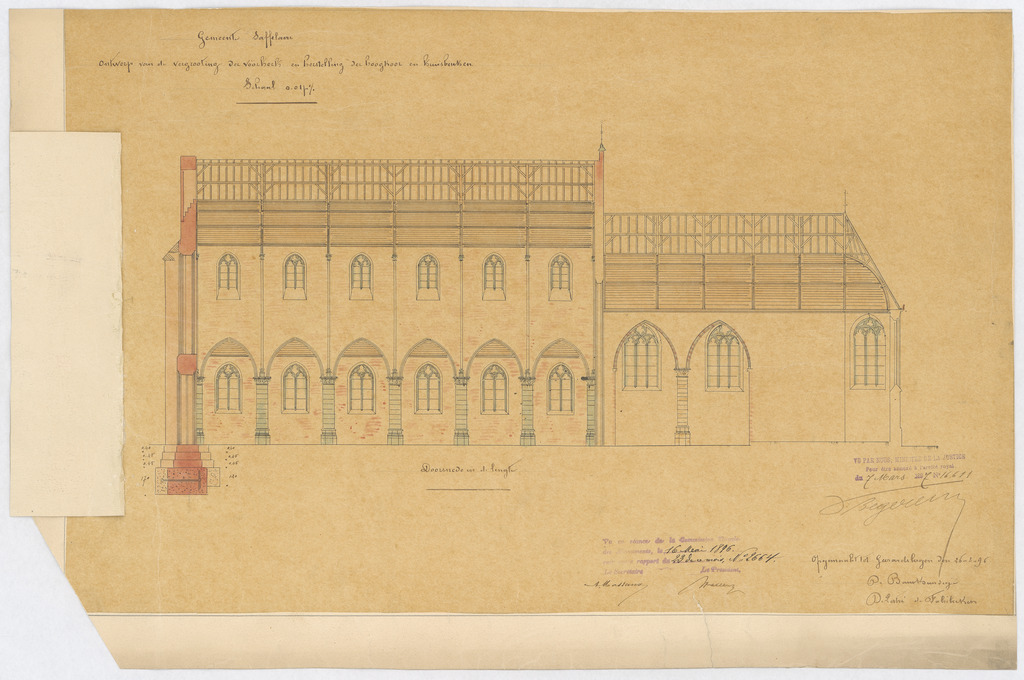 Opschrift: Gemeente Saffelaere. Ontwerp van de vergrooting der voorkerk en herstelling der hoogkoor en kruisbeuken. Omschrijving plan: langsdoorsnede Datum KCML: deze informatie wordt niet vermeld op het archiefstuk Archiefnummer: O0699_02