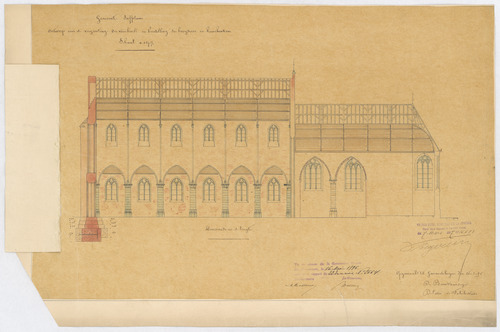 Drager: kalk op papier Techniek: pen, opgehoogd met aquarel, aanpassing opgekleefd Afmetingen (h x b in mm): 602 x 402 mm Schaal: 1/100
