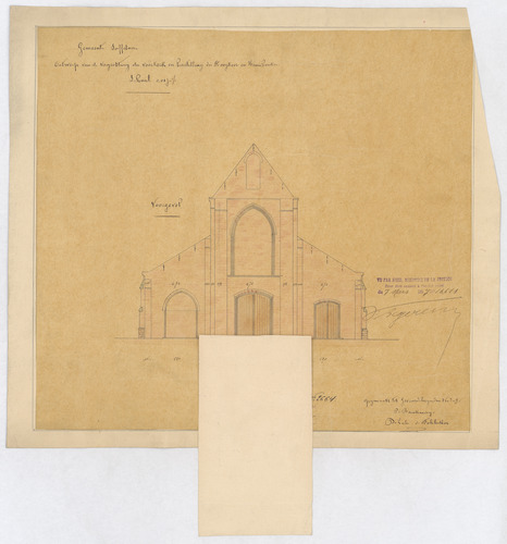 Opschrift: Gemeente Saffelaere. Ontwerp van de vergrooting der voorkerk en herstelling der hoogkoor en kruisbeuken. Omschrijving plan: opstand voorgevel Datum KCML: deze informatie wordt niet vermeld op het archiefstuk Archiefnummer: O0696_02