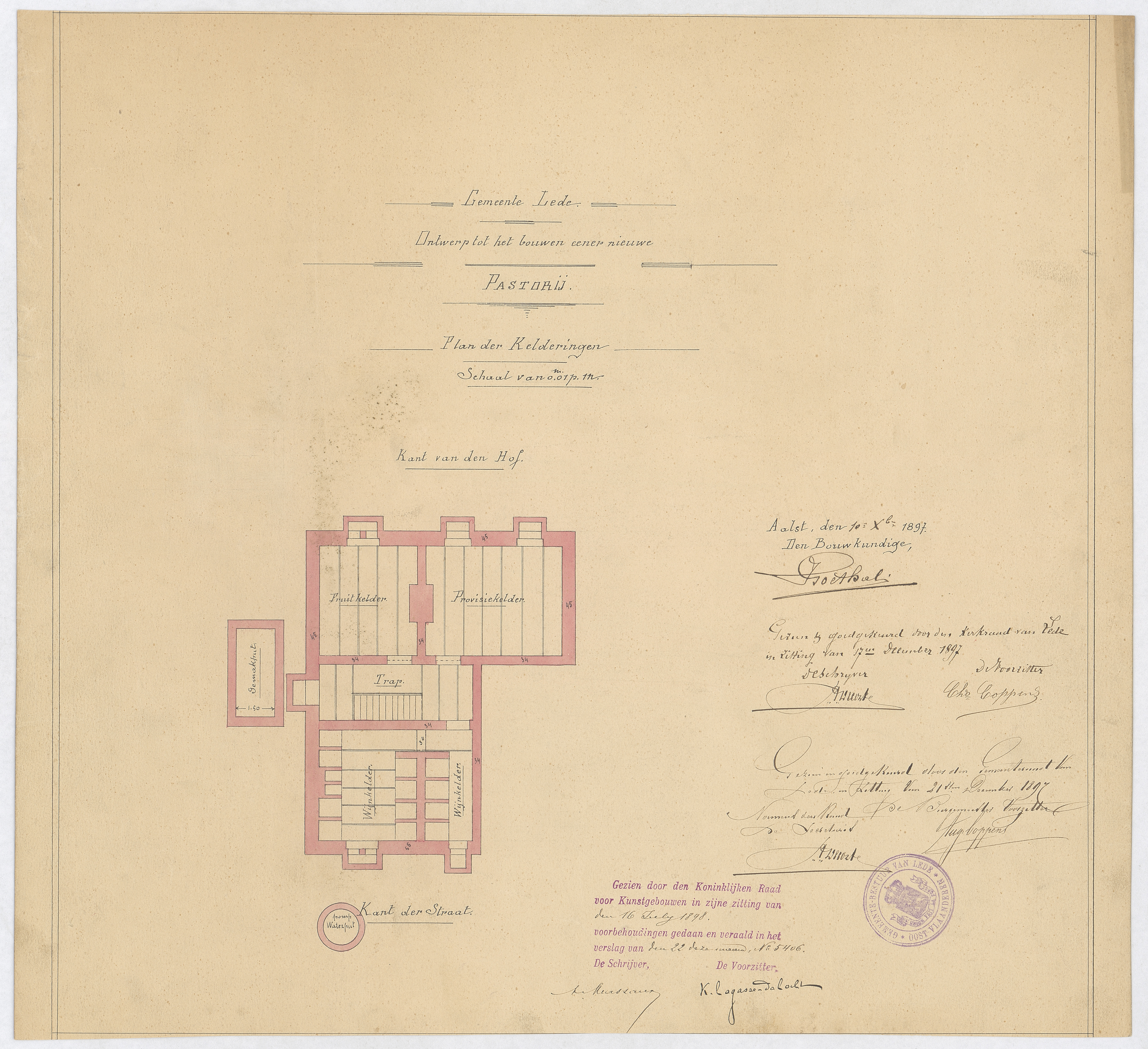 Opschrift: Gemeente Lede. Ontwerp tot het bouwen eener nieuwe pastorij. Omschrijving plan: plattegrond niveau -1 Datum KCML: 16/07/1898 Archiefnummer: O0671