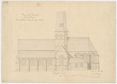 Opschrift: Provincie Oost-Vlaanderen. Gemeente Basel. Parochiekerk in haren huidigen staat. Omschrijving plan: opstand Z-gevel Datum KCML: deze informatie wordt niet vermeld op het archiefstuk Archiefnummer: O0627
