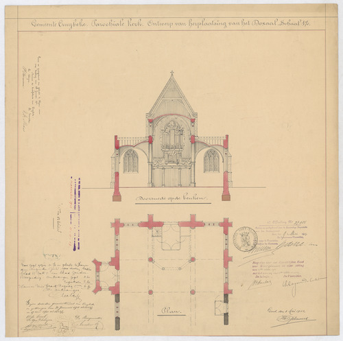 Opschrift: Gemeente Cruybeke. Parochiale kerk. Ontwerp van herplaatsing van het Doxaal. Omschrijving plan: plattegrond en dwarsdoorsnede doksaal Datum KCML: 7-10-1911 Archiefnummer: O0620