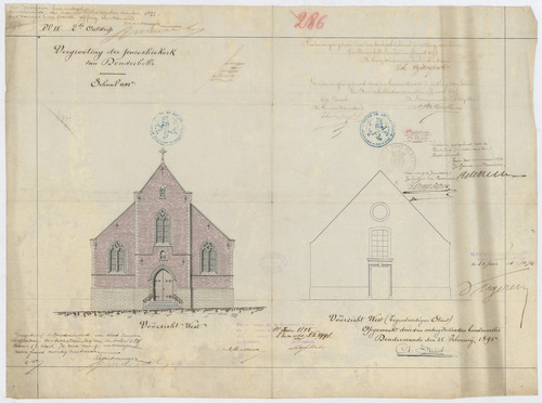 Opschrift: Vergrooting der parochiekerk van Denderbelle. Omschrijving plan: opstand voorgevel, huidige toestand en ontwerp Datum KCML: 01/06/1895 Archiefnummer: O0664