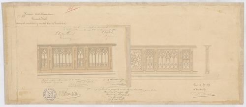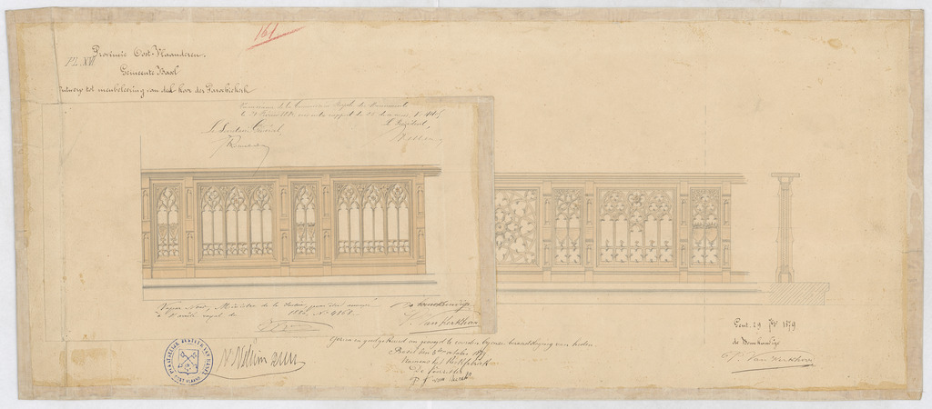 Opschrift: Provincie Oost-Vlaanderen. Gemeente Basel. Ontwerp tot meubeleering van den koor der parochiekerk. Omschrijving plan: vooraanzicht communiebank (aangepast ontwerp) Datum KCML: 21/02/1880 Archiefnummer: O0640_01
