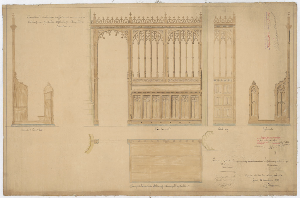 Opschrift: Parochiale kerk van Saffelaere. Ontwerp van gestoelten - afsluitingen - Hooge Koor Omschrijving plan: plattegrond, voor- en zijaanzicht koorafsluiting en gestoelte Datum KCML: 15-10-1904 Archiefnummer: O0715