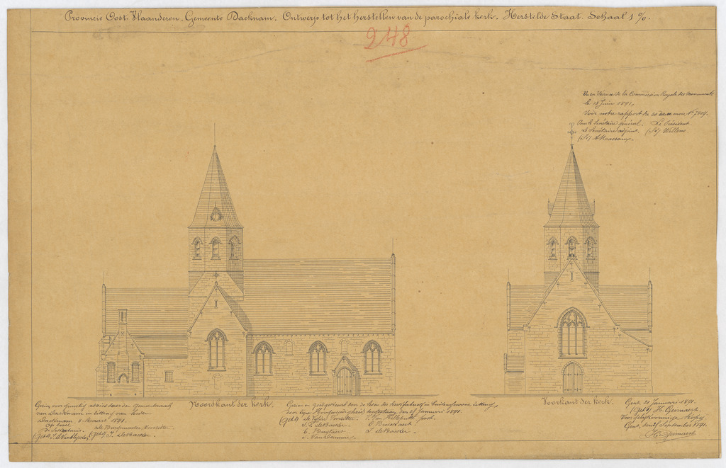 Opschrift: Provincie Oost-Vlaanderen. Gemeente Dacknam. Ontwerp tot het herstellen der parochiale kerk. Herstelde staat. Omschrijving plan: opstanden voorgevel en noordelijke zijgevel Datum KCML: deze informatie wordt niet vermeld op het archiefstuk Archiefnummer: O0730